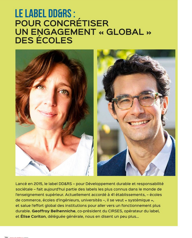 Lancé en 2015, le label DD&RS – pour Développement durable et responsabilité sociétale – fait aujourd’hui partie des labels les plus connus dans le monde de l’enseignement supérieur. Actuellement accordé à 41 établissements, – écoles de commerce, écoles d’ingénieurs, universités –, il se veut « systémique », et salue l’effort global des institutions pour aller vers un fonctionnement plus durable. Geoffroy Belhenniche, co-président du CIRSES, opérateur du label, et Elise CORITON, déléguée générale, nous en disent un peu plus…